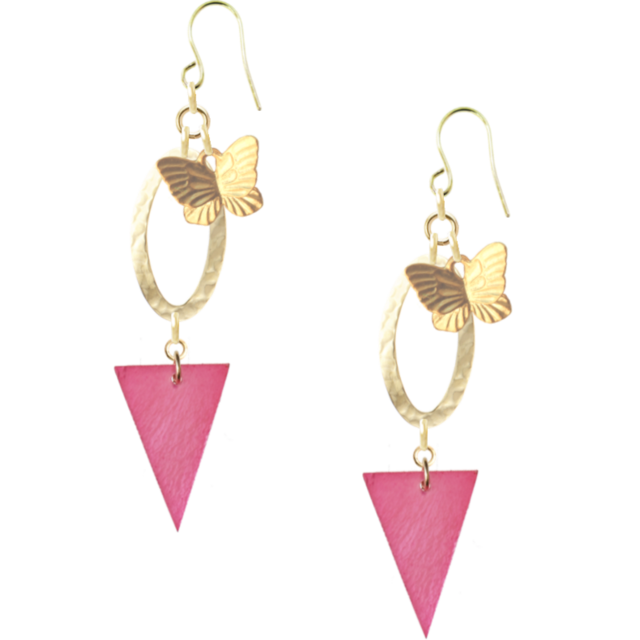 鮮やかなフューシャピンクの小さな蝶が、あなたの耳元で優雅に舞います。ナチュラルテイストのデザインとハンマーメタルリングが絶妙に組み合わさり、存在感を引き立てる一品です。