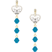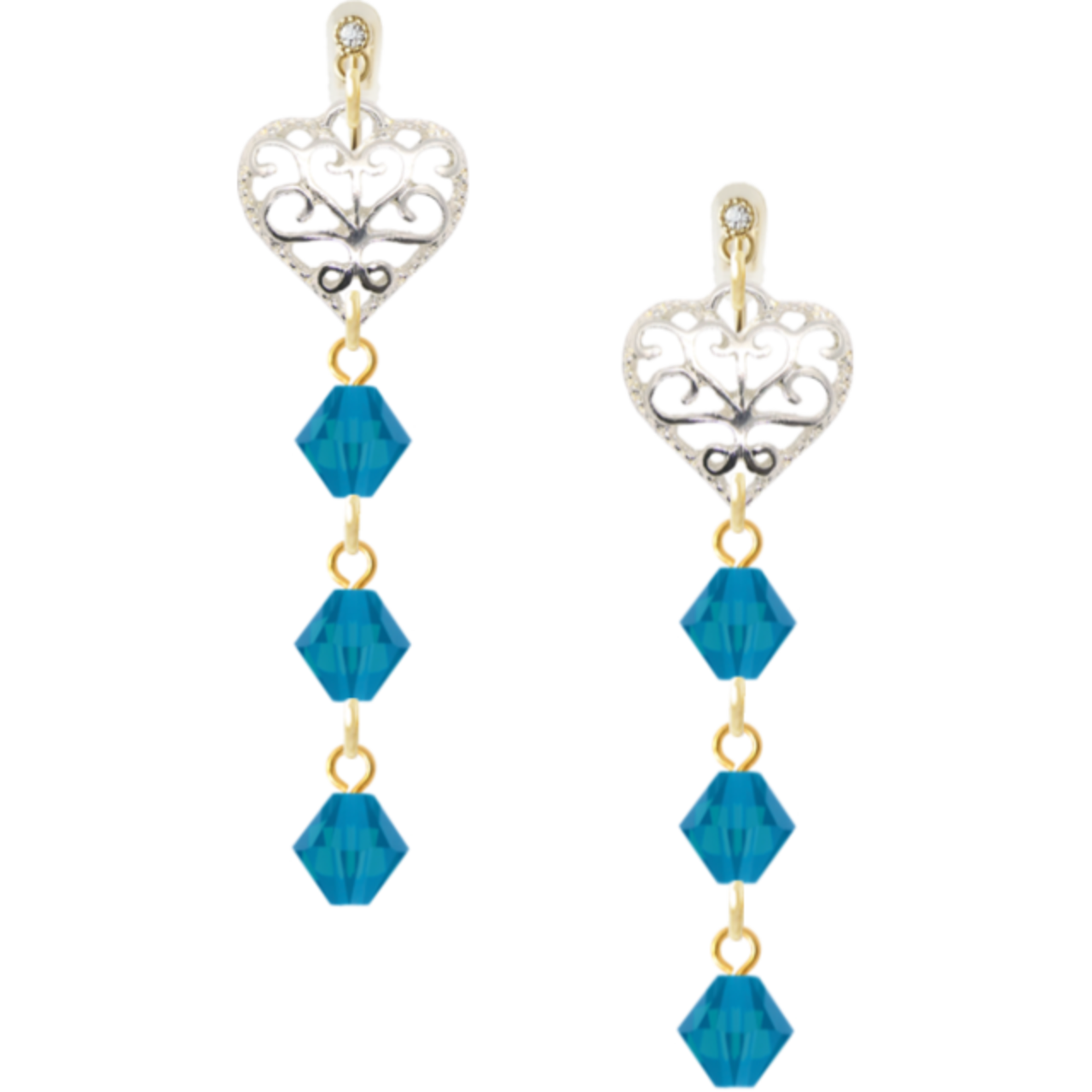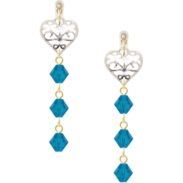 カリビアンブルーのスワロフスキーに、繊細なハートの透かしチャームを添えたノンホールピアス。耳元で輝く光が、あなたの魅力を一層引き立てます。